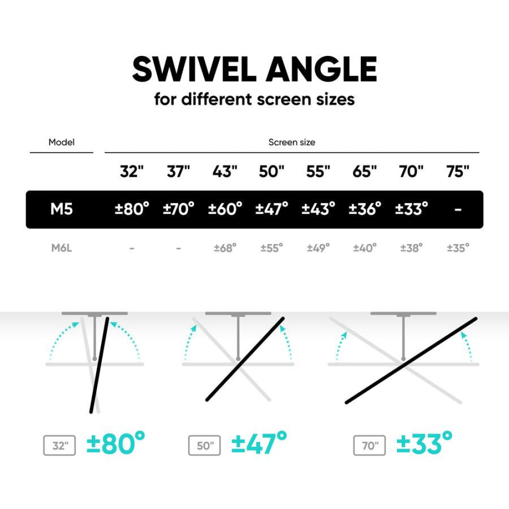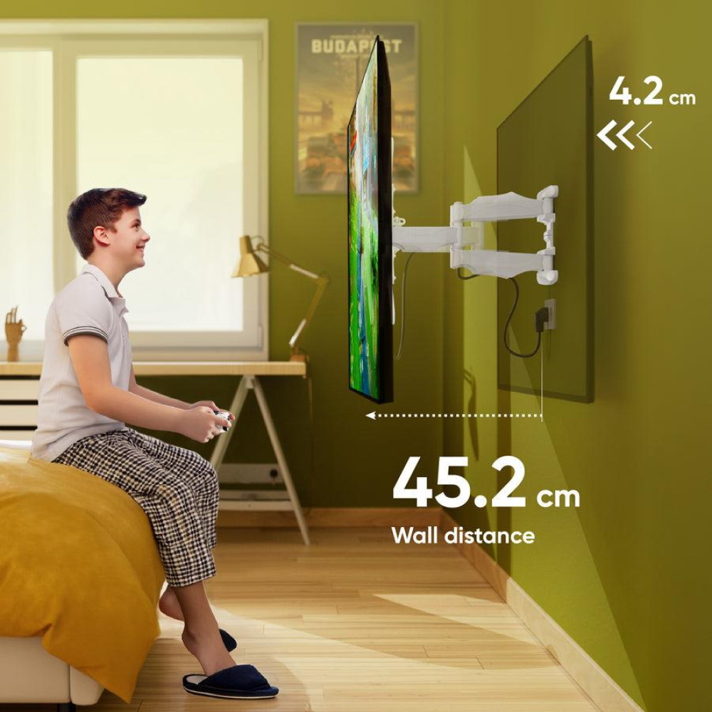 Summary ONKRON Tilting and swiveling TV bracket for 37-70 max 36 kg, white. Maximum weight capacity: 36.4 kg, Minimum screen size: 94 cm (37), Maximum screen size: 177.8 cm (70), Minimum VESA mount: 100 x 100 mm, Maximum VESA mount: 400 x 400 mm. Tilt angle range: -10 - 2°, Swivel angle range: -70 - 70°, Distance to the wall (min): 4.2 cm, Distance to the wall (max): 45.2 cm. Product colour: White