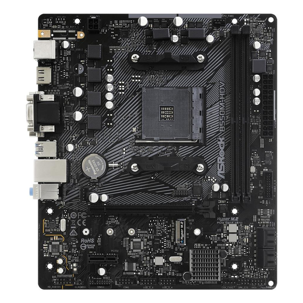 Summary Asrock B550M-HDV. Processor manufacturer: AMD, Processor socket: Socket AM4, Compatible processor series: AMD Ryzen 3000 Series. Supported memory types: DDR4-SDRAM, Maximum internal memory: 64 GB, Memory slots type: DIMM. Supported storage drive interfaces: M.2, SATA III. Graphics card family: AMD, Graphics card: Radeon Vega. Ethernet interface type: Gigabit Ethernet, LAN controller: Realtek RTL8111H