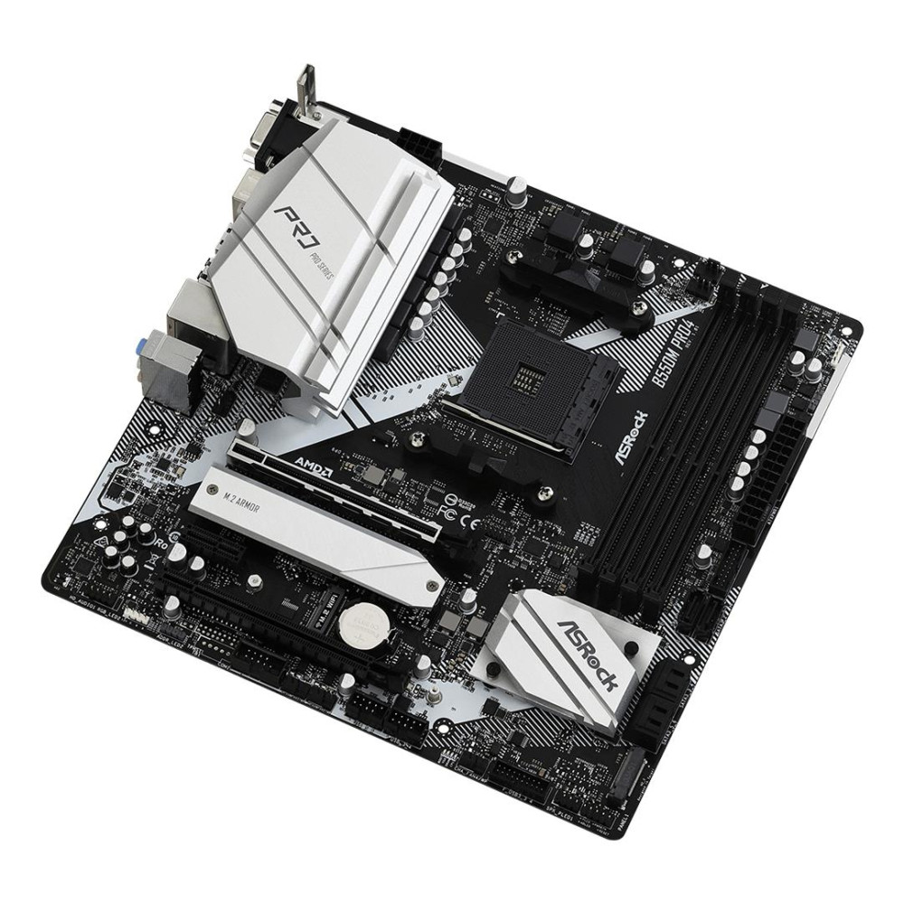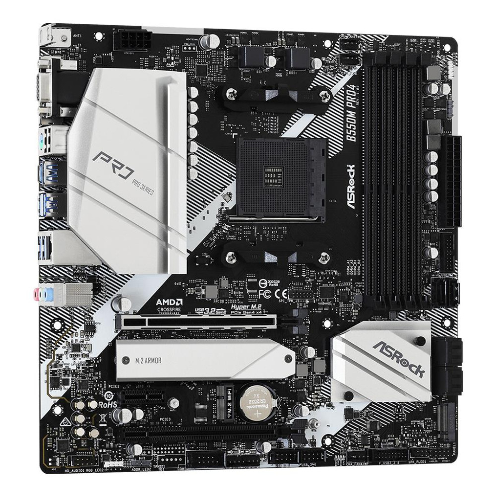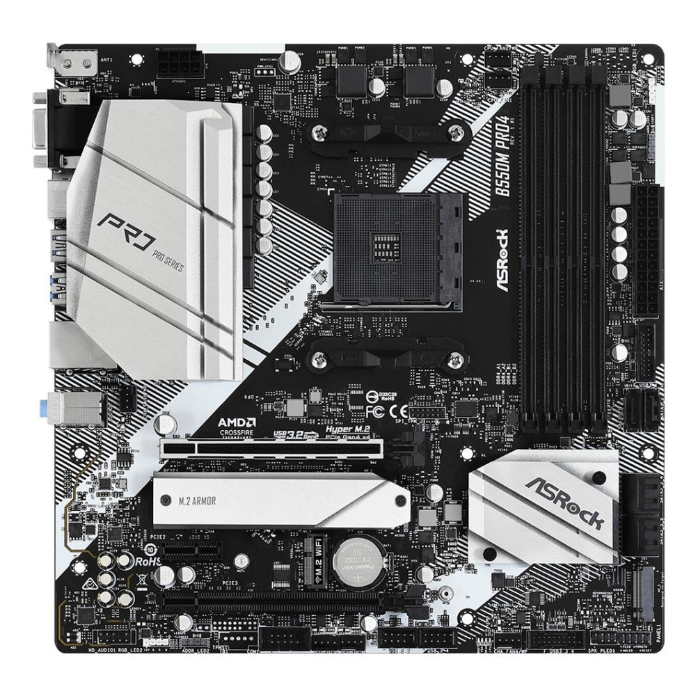 Summary Asrock B550M Pro4. Processor manufacturer: AMD, Processor socket: Socket AM4, Compatible processor series: AMD Ryzen 3000 Series. Supported memory types: DDR4-SDRAM, Maximum internal memory: 128 GB, Memory slots type: DIMM. Supported storage drive interfaces: M.2, SATA III, Supported storage drive types: HDD & SSD, RAID levels: 0, 1, 10. Parallel processing technology support: CrossFireX, Quad-GPU CrossFireX, Maximum resolution: 5120 x 2880 pixels. Ethernet interface type: Gigabit Ethernet, LAN controller: Realtek RTL8111H