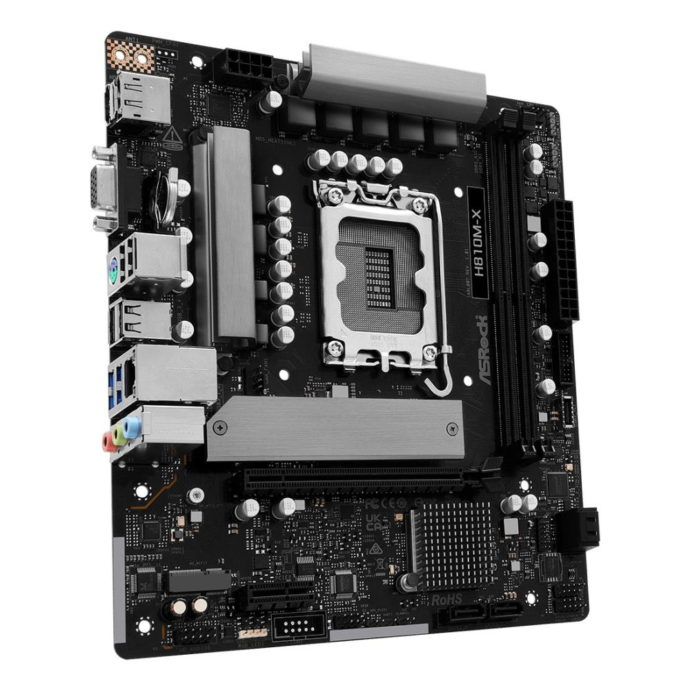 Asrock H810M-X. Processor manufacturer: Intel, Processor socket: LGA 1851 (Socket V1), Compatible processor series: Intel Core Ultra (Series 2). Supported memory types: DDR5-SDRAM, Maximum internal memory: 128 GB, Memory slots type: DIMM. Supported storage drive interfaces: M.2, SATA III, Supported storage drive types: HDD & SSD. Ethernet interface type: 2.5 Gigabit Ethernet, LAN controller: Dragon RTL8125BG. Component for: PC, Motherboard form factor: micro ATX, Motherboard chipset family: Intel