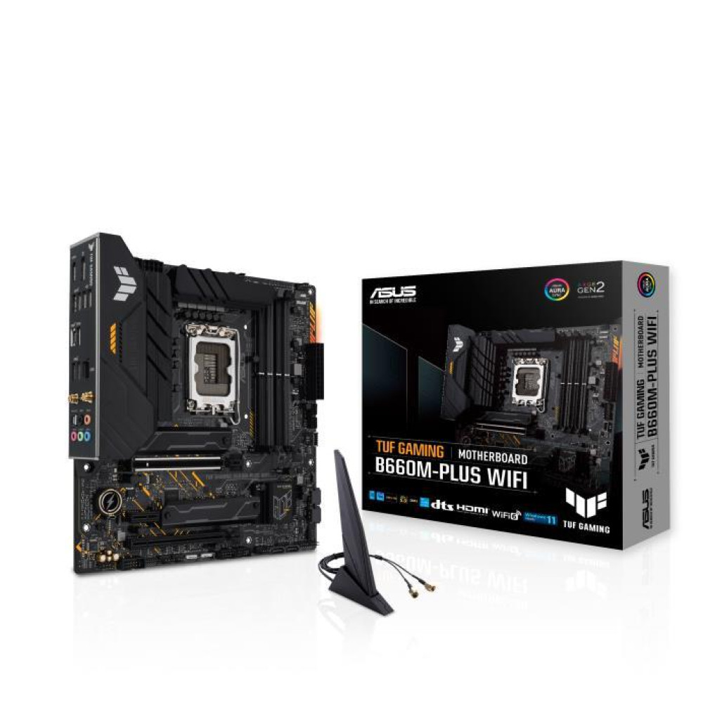 - TUF GAMING B660M-PLUS WIFIIntel® B660 (LGA 1700) mATX motherboard, 10+1 DrMOS Power stages , PCIe 5.0 support, DDR5 6000(OC), Dual PCIe 4.0 M.2 Slots with Heatsinks, Intel® Wi-Fi 6, Realtek 2.5Gb Ethernet, Rear USB 3.2 Gen 2x2 Type-C®, Front USB 3.2 Gen 1 Type-C®, Aura Sync, Two-way AI Noise CancelationIntel® LGA 1700 socket: Ready for 12th Gen Intel® processorsEnhanced power solution: 10+1 DrMOS power stages, six-layer PCB, 8+4 ProCool sockets, military-grade TUF components and Digi+ VRM for maximum durabilityComprehensive cooling: Enlarged VRM heatsink, Stack Cool 3+, M.2 heatsinks, PCH heatsink, hybrid fan headers and Fan Xpert 2+Latest connectivity: PCIe 5.0 slot, DDR5 memory, PCIe 4.0 M.2 slots, rear USB 3.2 Gen 2x2 Type-C®, front panel header for USB 3.2 Gen 1 Type-C® and Thunderbolt 4™ supportMade for online gaming: Intel® WiFi 6, Realtek 2.5Gb Ethernet, TUF LANGuardTwo-way AI Noise-Cancelation: Reduces background noise from the microphone and audio output for crystal-clear communication in games or video conferences