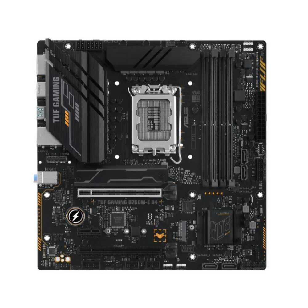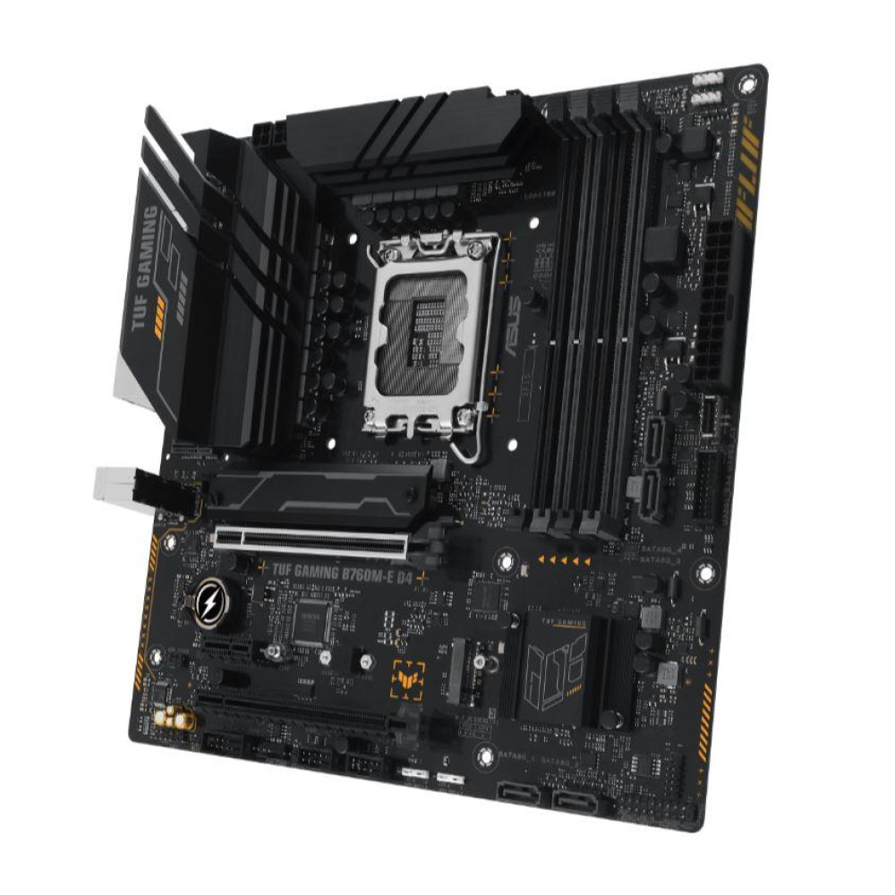 - TUF GAMING B760M-E D4 takes all the essential elements of the latest Intel® processors and combines them with game-ready features and proven durability. Engineered with military-grade components, an upgraded power solution and a comprehensive cooling system, this motherboard goes beyond expectations with rock-solid performance for marathon gaming. TUF GAMING motherboards also undergo rigorous endurance testing to ensure that they can handle conditions where others may fail. Aesthetically, this model incorporates an embossed nameplate and geometric design elements to reflect the dependability and stability that defines the TUF GAMING series.