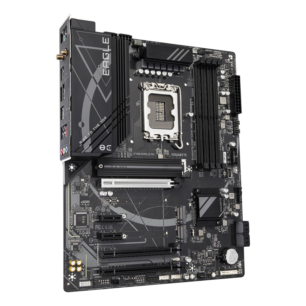 GIGABYTE Z790 EAGLE AX Motherboard - Supports Intel Core 14th Gen CPUs, 12+1+1Phases Digital VRM, up to 7600MHz DDR5 (OC), 3xPCIe 4.0 M.2, Wi-Fi 6E, 2.5GbE LAN, USB 3.2 Gen 2. Processor manufacturer: Intel, Processor socket: LGA 1700, Compatible processor series: Intel® Celeron®, Intel® Core™ i3, Intel® Core™ i5, Intel® Core™ i7, Intel® Core™ i9,.... Supported memory types: DDR5-SDRAM, Maximum internal memory: 192 GB, Memory slots type: DIMM. Supported storage drive interfaces: M.2, SATA III, Supported storage drive types: HDD & SSD, RAID levels: 0, 1, 5, 10. Maximum resolution: 4096 x 2304 pixels. USB connector type: USB Type-A, USB Type-C