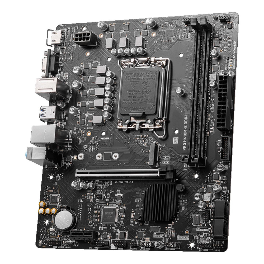 MSI PRO H610M-E DDR4. Processor manufacturer: Intel, Processor socket: LGA 1700, Compatible processor series: Intel® Core™ i9. Supported memory types: DDR4-SDRAM, Maximum internal memory: 64 GB, Memory slots type: DIMM. Supported storage drive interfaces: M.2, SATA III, Supported storage drive types: HDD & SSD. Ethernet interface type: Gigabit Ethernet. Component for: PC, Motherboard form factor: micro ATX, Motherboard chipset family: Intel