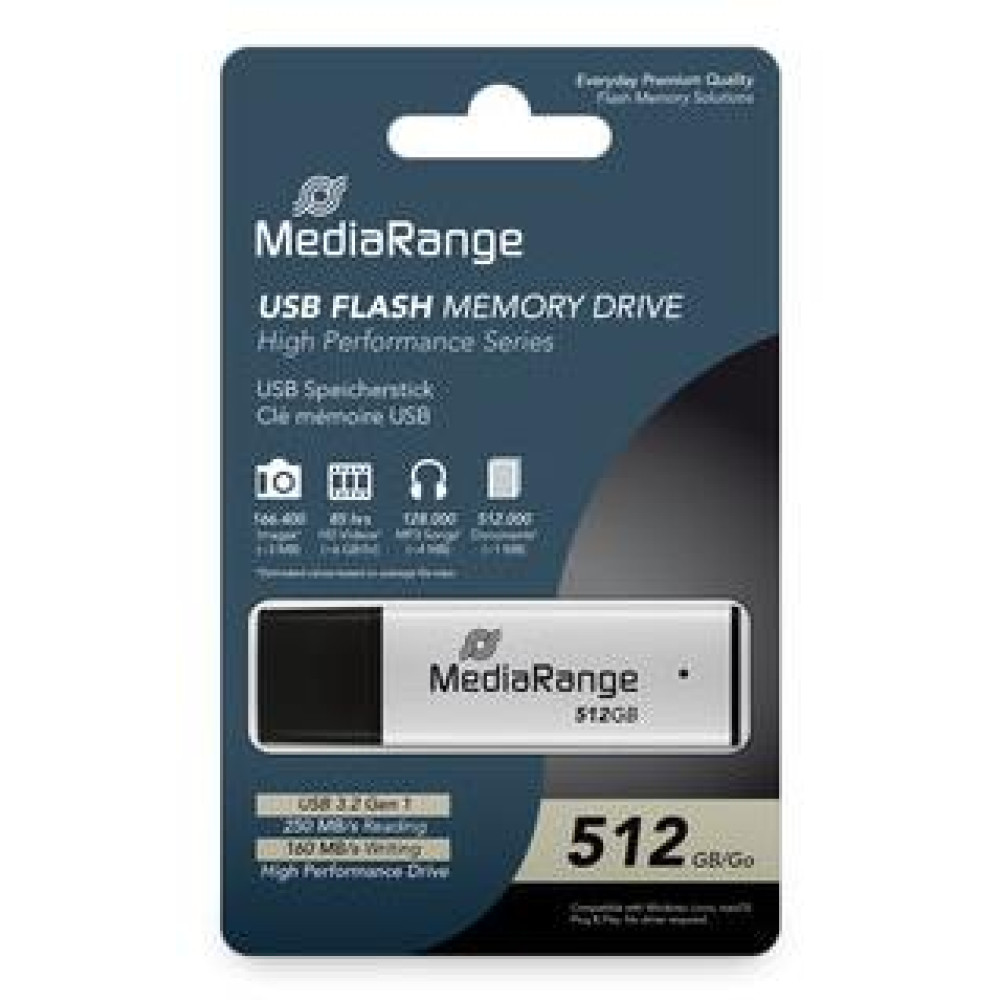 MediaRange MR1904. Capacity: 512 GB, Device interface: USB Type-A, USB version: 3.2 Gen 1 (3.1 Gen 1), Read speed: 250 MB/s, Write speed: 160 MB/s. Form factor: Cap. Weight: 15 g. Product colour: Black, Silver