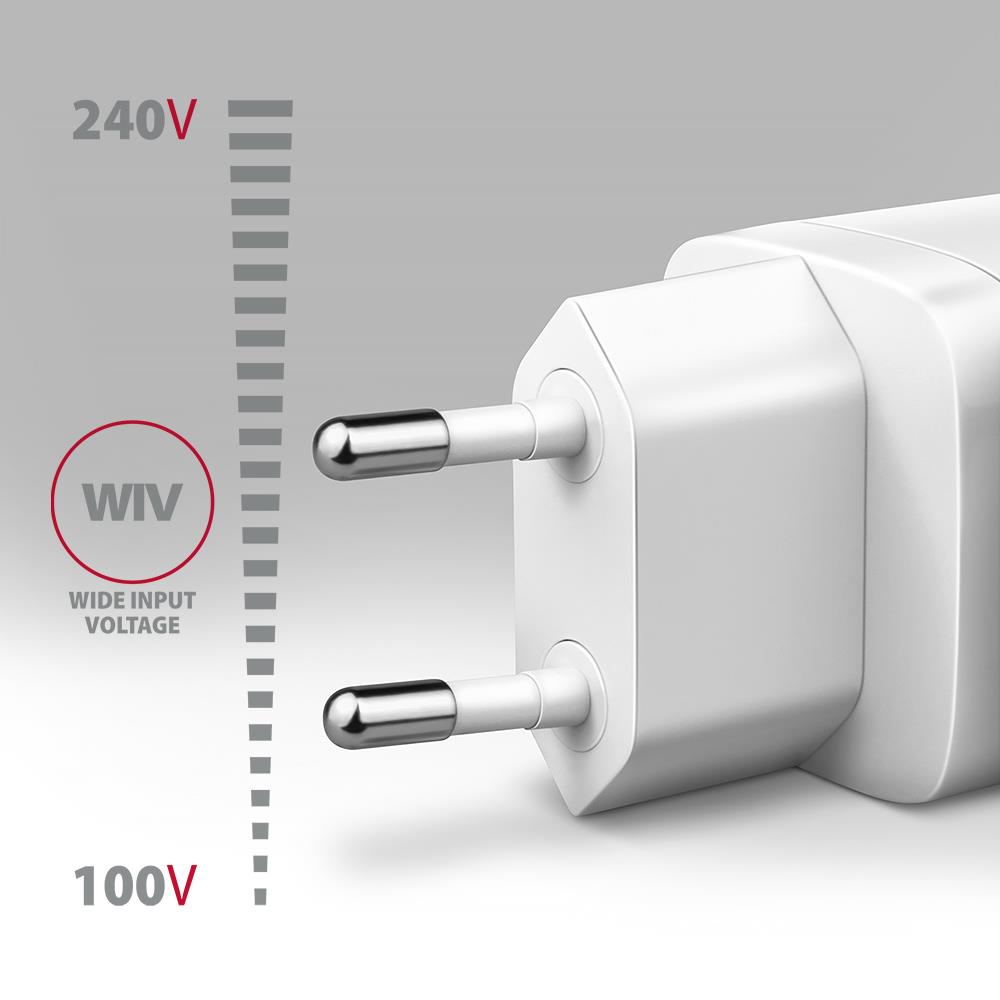 Summary Axagon ACU-PQ20W PD3.0 & QC4+ DUAL OUTPUTS wall charger 20W. Charger type: Indoor, Power source type: AC, Charger compatibility: Universal. Input voltage: 100 - 240 V, Maximum output voltage: 20 V. USB 2.0 ports quantity: 1, USB Type-C ports quantity: 1, Fast charging, Power protection features: Over voltage, Overheating, Overload, Short circuit. Product colour: White
