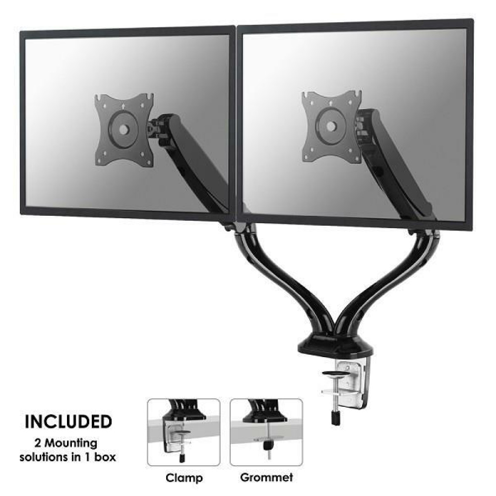 • The Neomounts Select desk mount, model NM-D500DBLACK is a tilt-, swivel and rotatable desk mount for 2 flat screens up to 27?. This mount is a great choice for space saving placement on desks using a desk clamp or grommet mount. Neomounts Select's versatile tilt (180°), rotate (360°) and swivel (360°) technology allows the mount to change to any viewing angle to fully benefit from the capabilities of the flat screen. The mount is easily individually height adjustable from 8 to 41 centimetres using a gas spring. Depth adjustable from 0 to 51 centimetres. An innovative cable management conceals and routes cables from mount to flat screen. Hide your cables to keep the workplace nice and tidy. Neomounts Select NM-D500DBLACK has three pivot points and is suitable for screens up to 27 (69 cm). The weight capacity of this product is 6 kg each screen. The desk mount is suitable for screens that meet VESA hole pattern 75x75 or 100x100mm. Different hole patterns can be covered using Neomounts Select VESA adapter plates. By using an ergonomic mount neck- and back complaints can be avoided. Ideal for use in offices and on counters or in a reception area. All installation material is included with the product