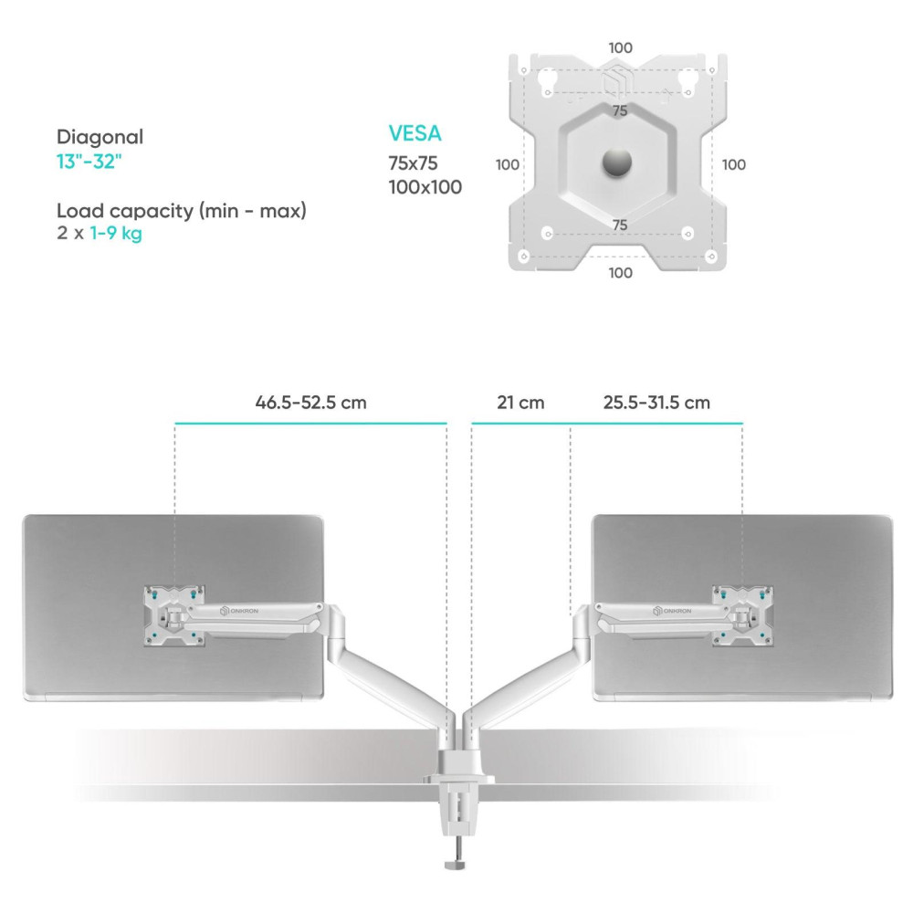 ONKRON G200-W. Mounting: Clamp/Grommet, Maximum weight capacity: 18 kg, Minimum screen size: 33 cm (13), Maximum screen size: 81.3 cm (32), Minimum VESA mount: 75 x 75 mm, Maximum VESA mount: 100 x 100 mm. Height adjustment, Tilt angle range: -90 - 45°. Product colour: White