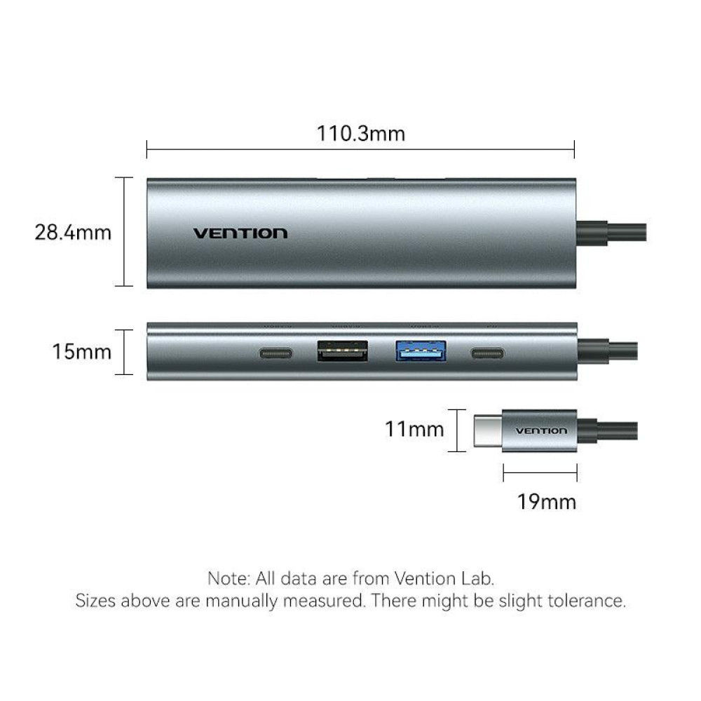 Vention USB-C to HDMI + USB 3.0 + USB 2.0 + USB 2.0 Type-C + PD Docking Station. Connectivity technology: Wired, Host interface: USB 3.2 Gen 1 (3.1 Gen 1) Type-C, USB Power Delivery up to: 100 W. Product colour: Grey, HD type: 4K Ultra HD, Hub interfaces: HDMI, USB 2.0, USB 3.0, USB Type-C. Power supply type: USB. Other operating systems supported: Android, iOS, iPadOS. Width: 28.4 mm, Depth: 110.3 mm, Height: 15 mm