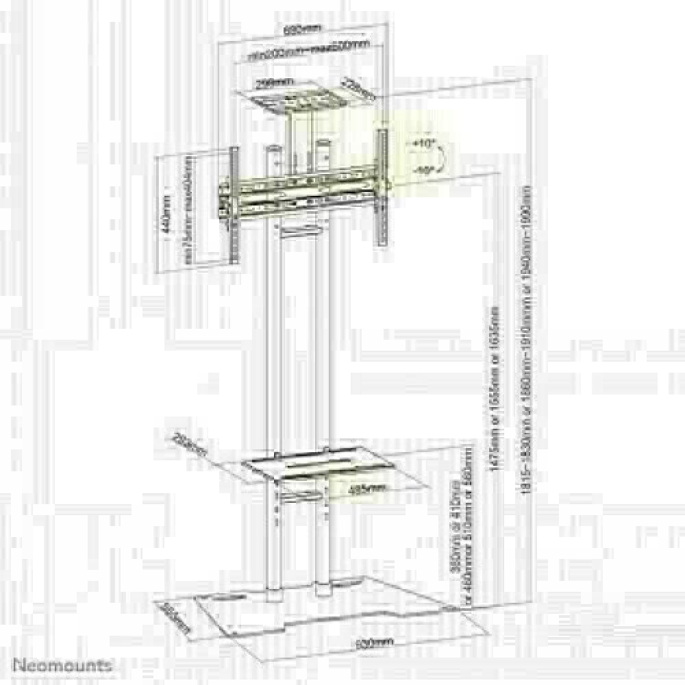 The Neomounts by Newstar floor stand, model PLASMA-M1700ES is a floor stand for flat screens up to 70". This stand is a great choice for space saving placement or when wall-, ceiling mounting or desk placement is not an option. This stand stretches your investment by serving a variety of projection needs by sharing a large display over multiple rooms. Get optimal positioning for both standing and seated audiences, in any application, in any part of your location. Neomounts by Newstar's versatile tilt (20°) technology allows the mount to change to any viewing angle to fully benefit from the capabilities of the flat screen. The mount is manually height adjustable from 147,5 to 163,5 centimetres. An innovative cable management conceals and routes cables from mount to flat screen. Hide your cables to keep the stand nice and tidy. Neomounts by Newstars' floor stand, PLASMA-M1700ES holds your TV, AV equipment and even hides your cables. Neomounts by Newstar PLASMA-M1700ES has one pivot point and is suitable for screens up to 70" (178 cm). The weight capacity of this product is 50 kg for the screen, 10 kg for the multimedia shelf and 5 kg for the camera shelf. The multimedia shelf is height adjustable from 36 to 56 cm. The camera shelf is height adjustable from 181,5 to 199 cm. The stand is suitable for screens that meet VESA hole pattern 200x200 to 600x450mm. All installation material is included with the product.