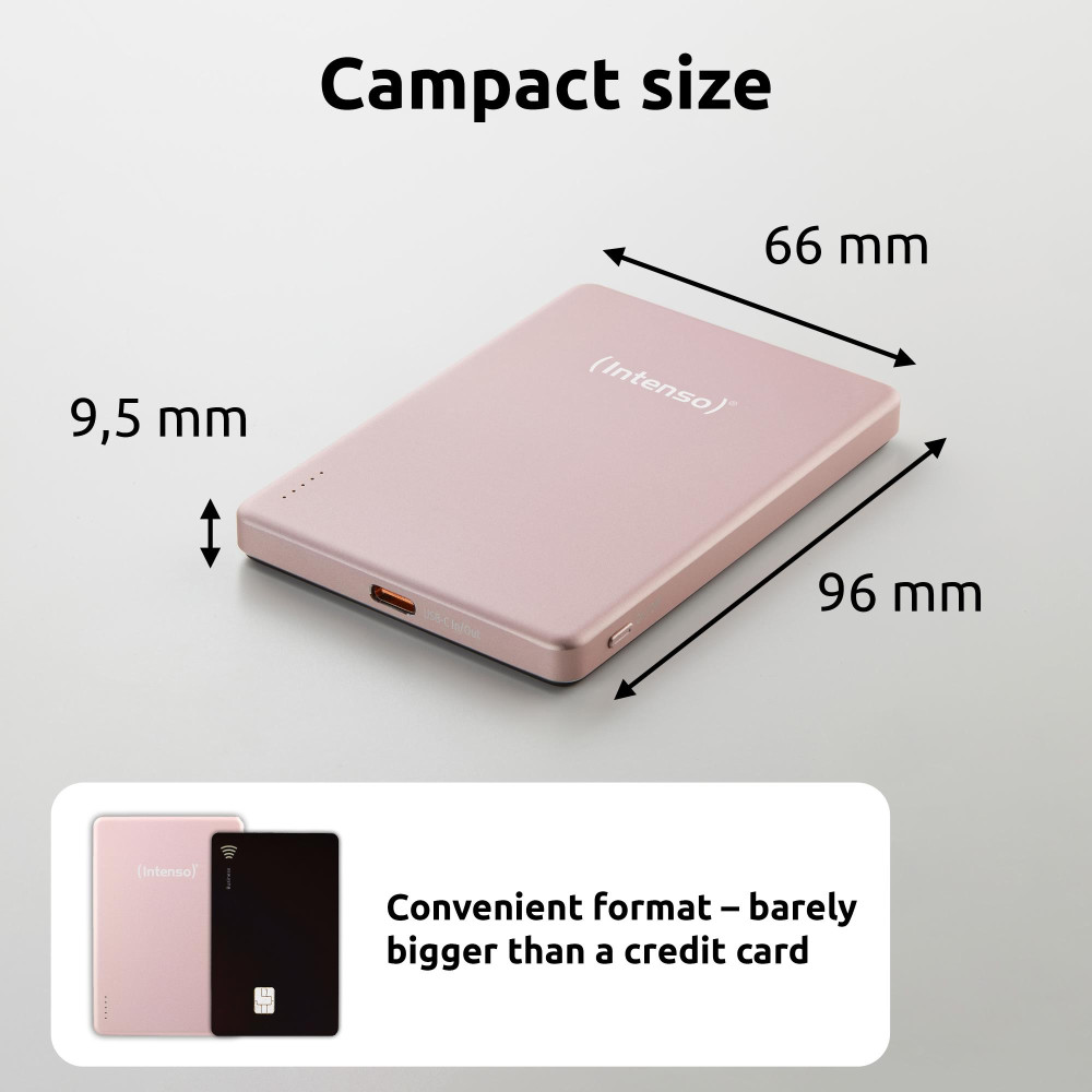Intenso MW5000 Magnetic Power Bank 5000 mAh – MagSafe Compatible, 15W Wireless Charging, 20W USB-C PD, Slim & Compact – Tested in Germany – Rosé. Battery capacity: 5000 mAh, Battery technology: Lithium Polymer (LiPo), Fast charging technology: Power Delivery, Programmable Power Supply (PPS), Battery voltage: 3.85 V. USB Type-C ports quantity: 1. Wireless charging. Product colour: Rose