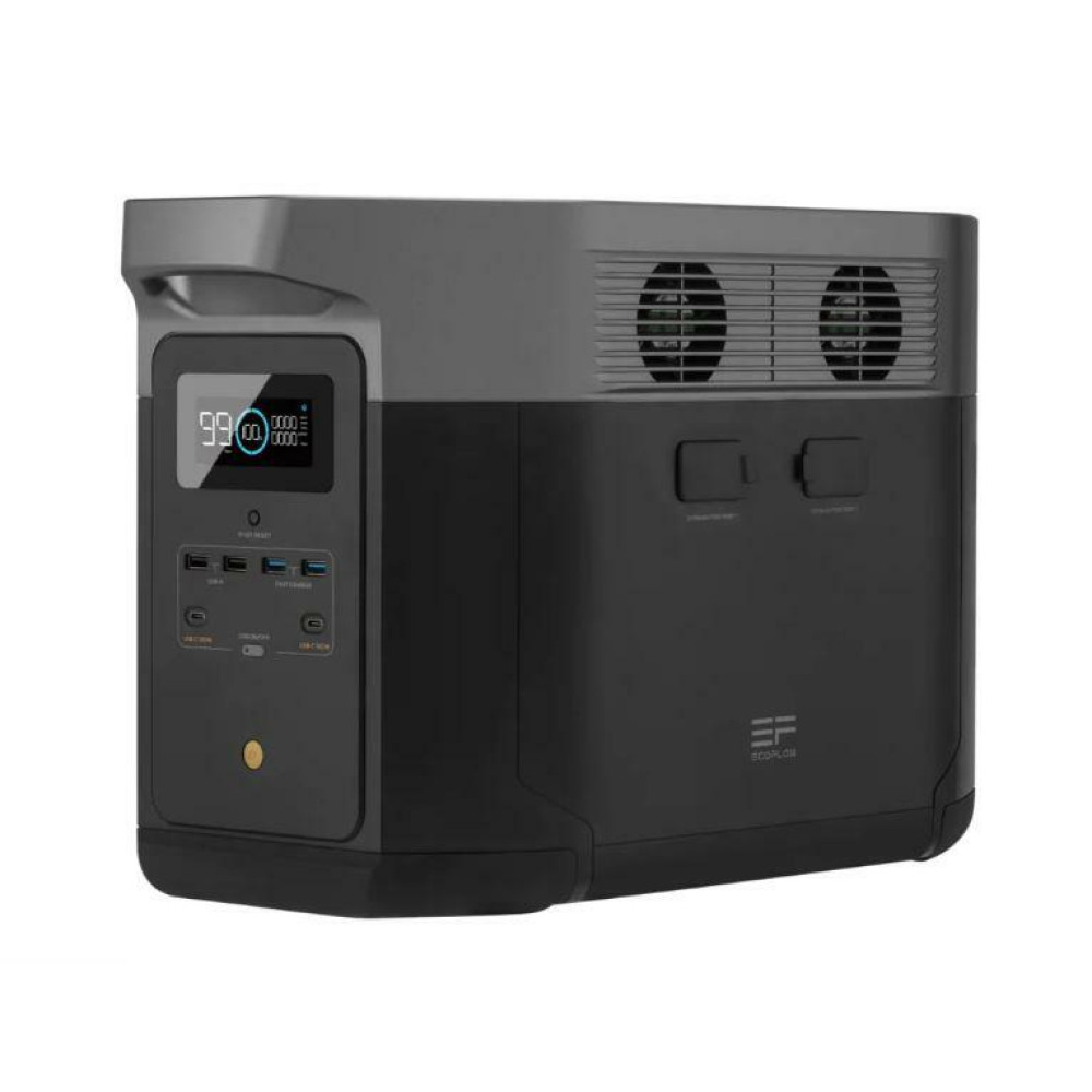 - Power station, Battery Lithium-Ion rechargeable, Capacity 2016 Wh, Max output 2000 Watts, 4xAC Outputs, 4xUSB-A, 1xCar Power, 2xDC5521, 2xUSB-C, Solar Charging 11-100V 13A Max, 800W max, AC Charging 2000 Watts, Cycle life 800 cycles to 80%+ capacity, Extra battery support Supports up to 2 DELTA Max Smart Extra Batteries / Smart generator, Wireless connections WLAN, Dimensions 49.7 x 24.2 x 30.5 cm, Weight 22 kg