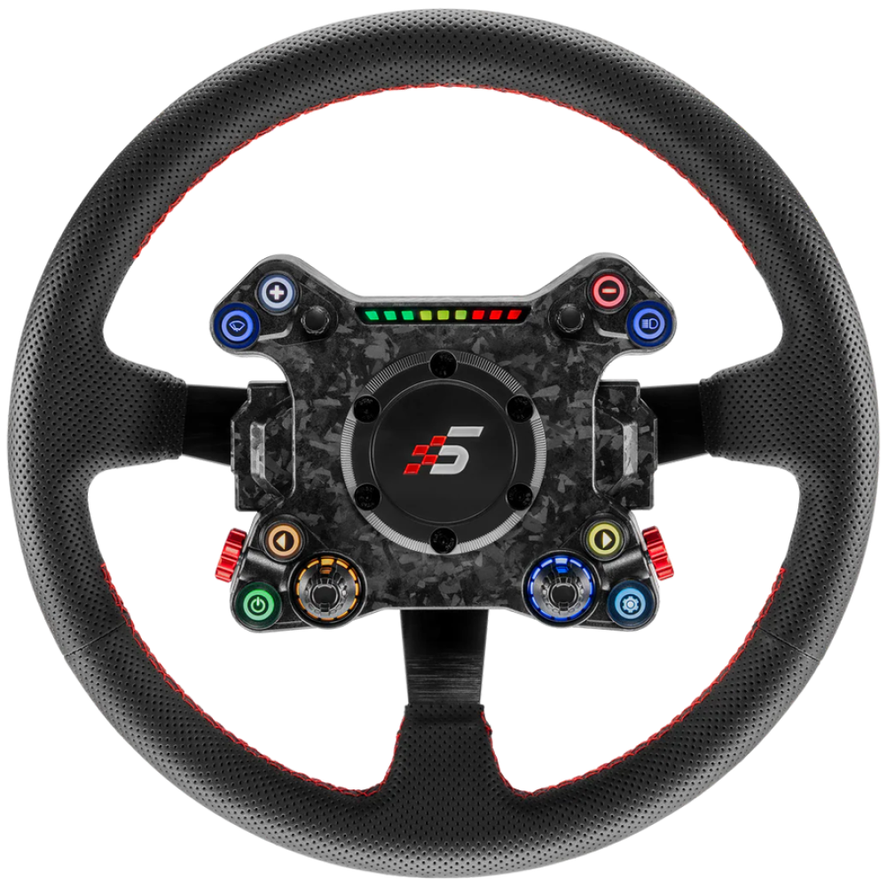 Quick Release 50mm, SimPro Manager, Leather Coating, Carbon Fiber Plate, 2 x 7-way Multi-position Switch, Round Rim, Customizable Paddle Modules, 2 x 12-Set Programmable LED Encoders, 2 x Thumb Knob Encoders, Aluminum Frame