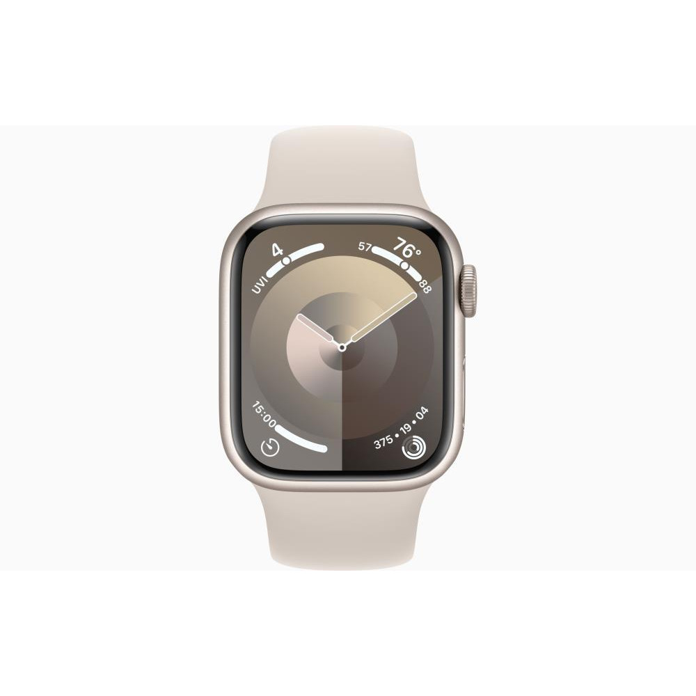 - Watch Series 9,Screen 1.69,Display technology OLED,Resolution 430 x 352,Wireless connections WLAN/Bluetooth/NFC,CPU Apple S9, Dual-core,Memory 64GB,GPS,Material housing Aluminium,Colour Starlight,Operating System watchOS,Dimensions 41 x 35 x 10.7 mm,Weight 0.031 kg