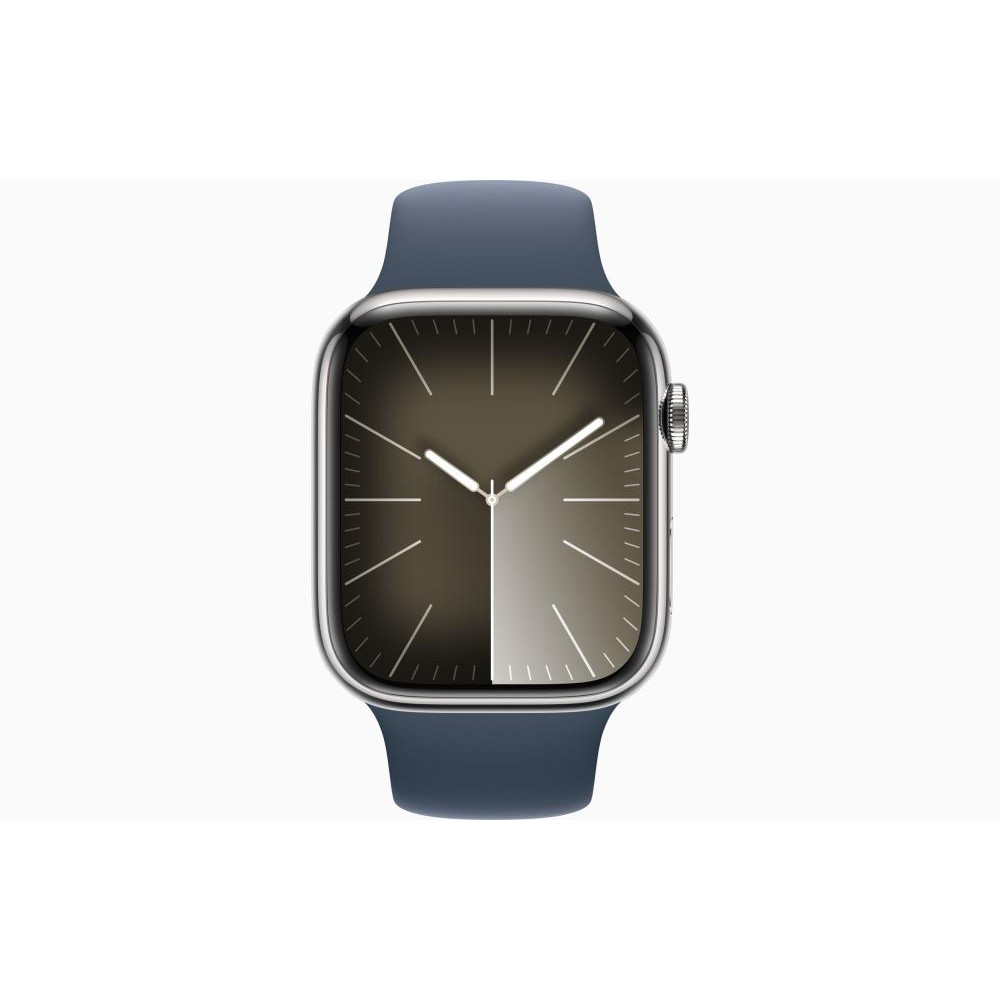 • Apple Watch Series 9 GPS + Cellular 45mm Silver Stainless Steel Case with Storm Blue Sport Band - M/L - Brighter Always-On Retina display with a durable, crack-resistant front crystal