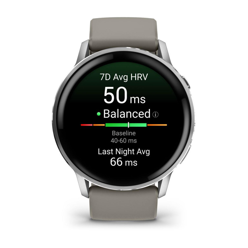 Garmin Venu 4. Display diagonal: 3.56 cm (1.4), Display technology: AMOLED, Display resolution: 454 x 454 pixels, Touchscreen. Flash memory: 8 GB. Wi-Fi. GPS (satellite). Weight: 38 g. Band material: Silicone, Band colour: Grey, Silver