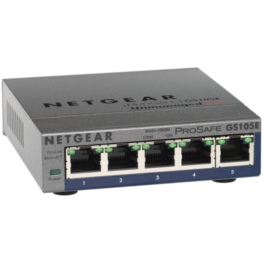 Switch NETGEAR GS105E, 5x 10/100/1000 Prosafe PLUS Switch (management via PC utility), VLAN, QOS, metal casing, External Power Adapter