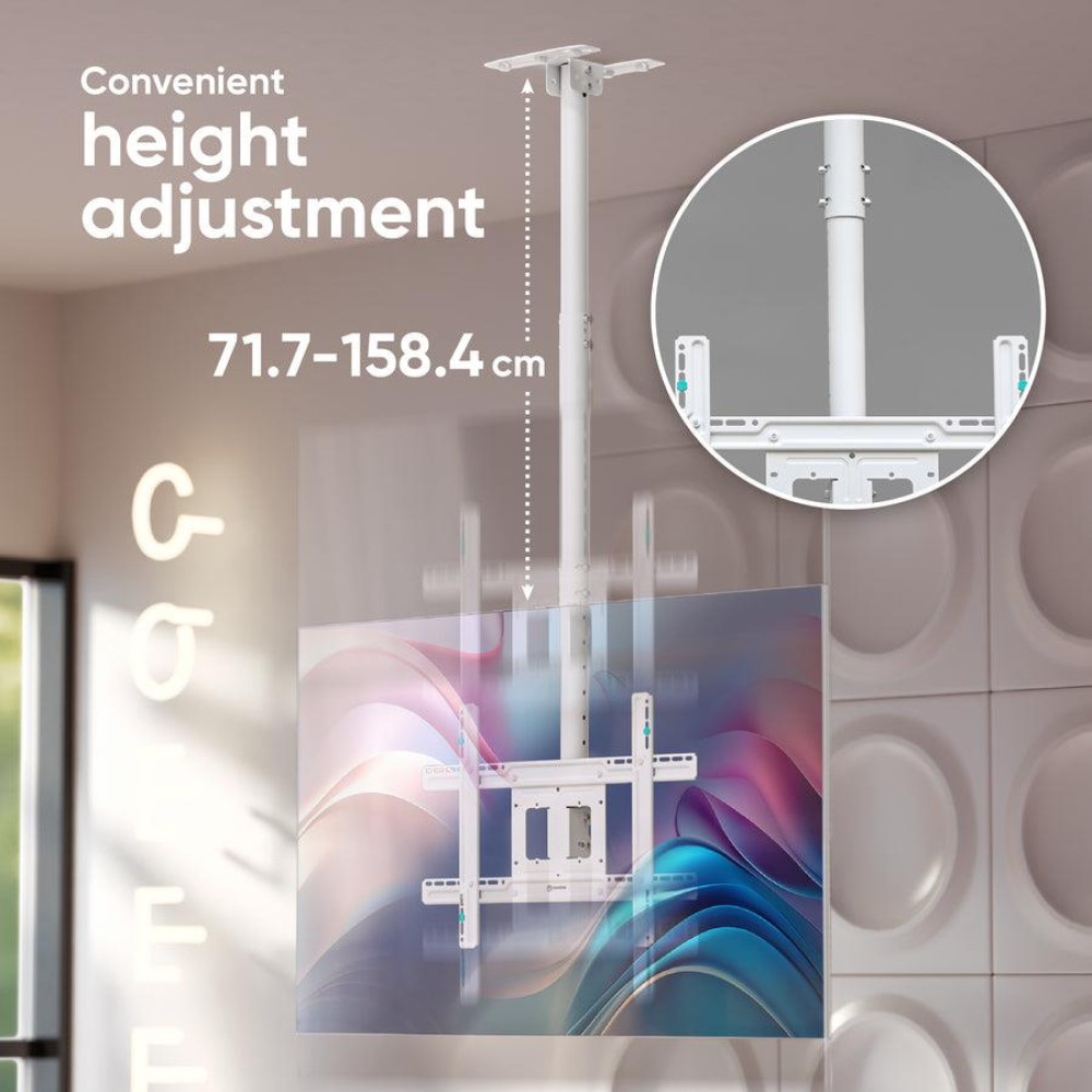 Summary ONKRON Ceiling mount for TV 32-80 max 68 kg, tilt-swivel, white. Maximum weight capacity: 68.2 kg, Minimum screen size: 81.3 cm (32), Maximum screen size: 2.03 m (80), Minimum VESA mount: 100 x 100 mm, Maximum VESA mount: 600 x 400 mm. Tilt angle range: -5 - 15°, Swivel angle range: -30 - 30°. Product colour: White