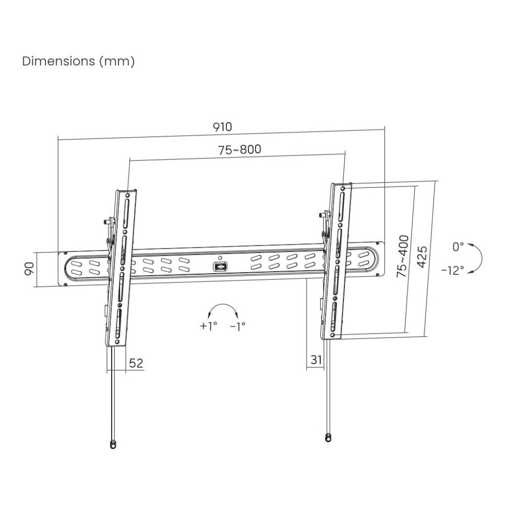 Gembird PRO series. Maximum weight capacity: 60 kg, Minimum screen size: 109.2 cm (43), Maximum screen size: 2.41 m (95), Minimum VESA mount: 200 x 200 mm, Maximum VESA mount: 800 x 400 mm. Tilt angle range: 0 - 12°, Distance to the wall (max): 3.1 cm. Product colour: Black