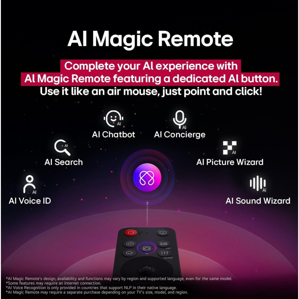 LG technologies (AV/TV) AI Room Calibration/AI Super Upscaling 4K/Bluetooth Surround Ready/LG Channels/LG Sound Sync/Magic Remote Control/ThinQT/Works With Apple HomeKit/WOW Orchestra