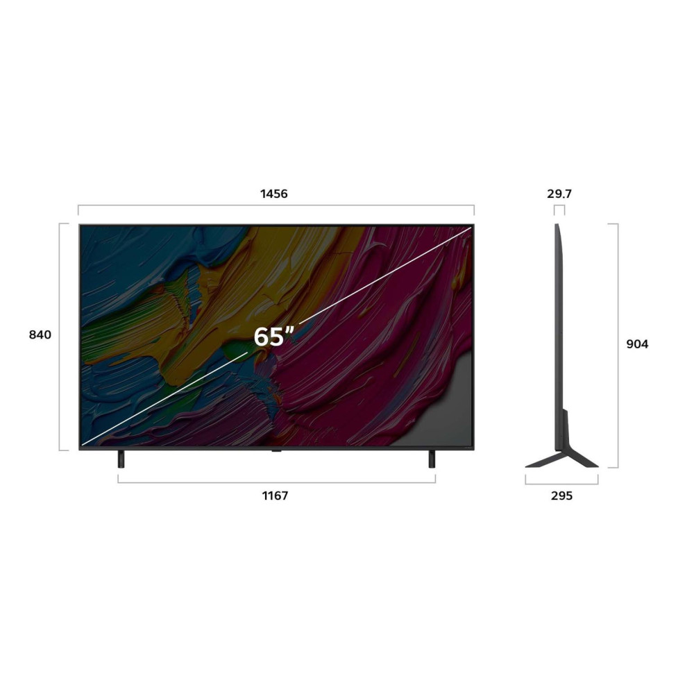 LG QNED 65QNED80A3A. Display diagonal: 165.1 cm (65), Display resolution: 3840 x 2160 pixels, HD type: 4K Ultra HD, Display technology: QNED, Screen shape: Flat, LED backlighting type: Dynamic Edge-LED. Smart TV. Native aspect ratio: 16:9. Digital signal format system: DVB-C, DVB-S, DVB-S2, DVB-T, DVB-T2. Wi-Fi, Ethernet LAN. Product colour: Black