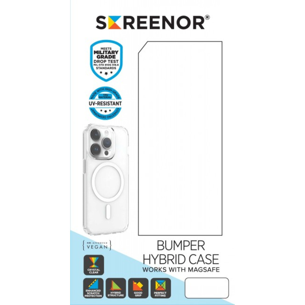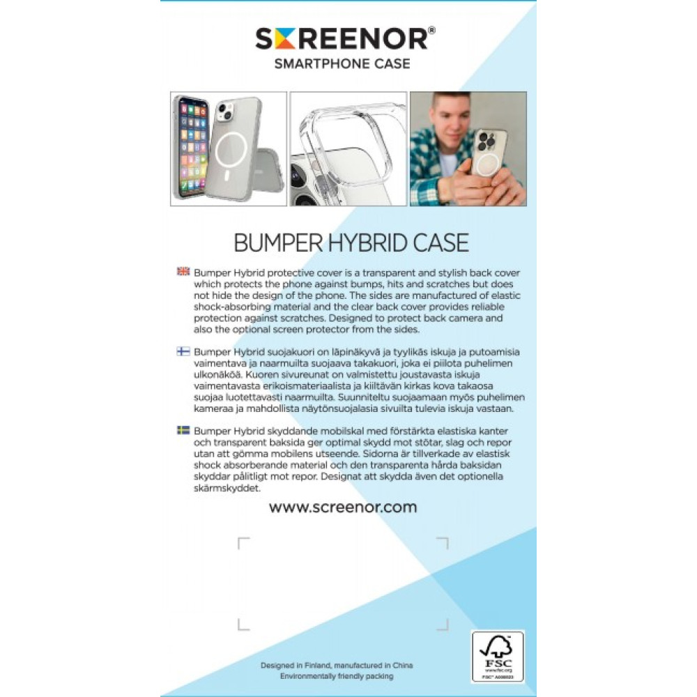 Screenor Bumper ? protective cover is a clear and stylish MagSafe compatible back cover which protects the phone against bumps, hits and scratches without hiding the design of the phone. The sides are manufactured of German elastic shock-absorbing UV-protected Desmopan TPU -speciality material and the clear back provides reliable protection against scratches.