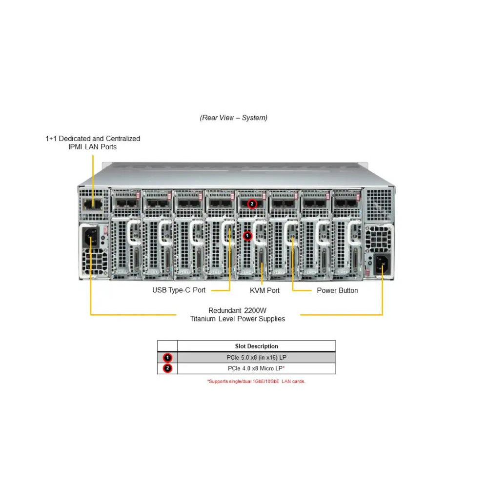 - Case Type 3U rack, CPUs AMD EPYC, Maximum number of CPUs 8, Memory type DDR5, Memory slots 4, PSU Redundant-Power-Capable, PSU Output Power 2200 Watts, GPU quantity 1
