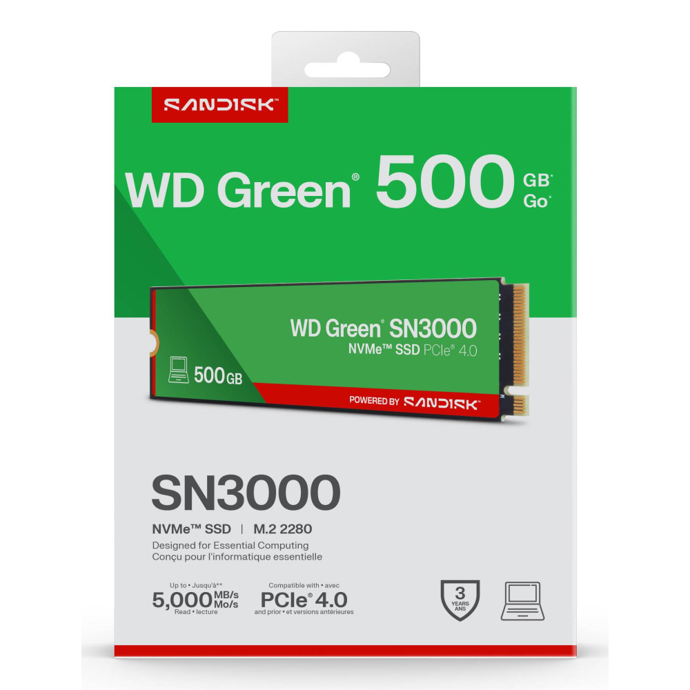 Summary SanDisk Green WD ™ SN3000 NVMe™ SSD POWERED BY 500 GB. SSD capacity: 500 GB, SSD form factor: M.2, Component for: PC/Notebook/Game console