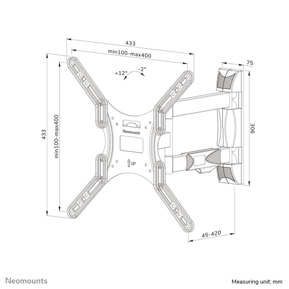 Neomounts WL40-550BL14 TV mount wall 40-55 - full motion - easy install. Maximum weight capacity: 35 kg, Minimum screen size: 101.6 cm (40), Maximum screen size: 139.7 cm (55), Minimum VESA mount: 100 x 100 mm, Maximum VESA mount: 400 x 400 mm. Tilt angle range: -2 - 12°, Swivel angle range: 0 - 40°, Angle of rotation: 6°, Distance to the wall (min): 4.5 cm, Distance to the wall (max): 42 cm. Product colour: Black