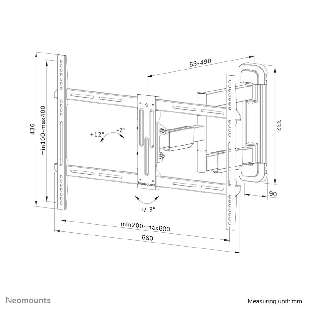 Neomounts WL40-550BL16. Максимальная емкость (вес): 40 kg, Минимальная совместимость от размера экрана: 101,6 cm (40), Максимальный размер экрана: 165,1 cm (65), Минимальное крепление VESA: 200 x 100 mm, Максимальное крепление VESA: 600 x 400 mm. Угол наклона: -2 - 12°, Диапазон углов поворота: -45 - 45°, Угол вращения: 6°, Расстояние от стены (мин): 5,3 cm, Расстояние от стены (макс): 49 cm. Цвет товара: Черный