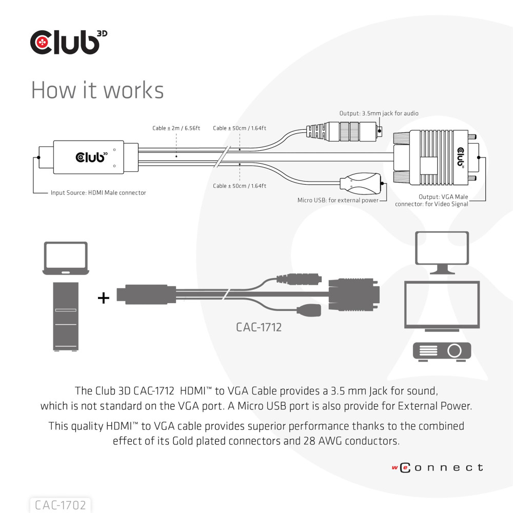 CLUB3D CAC-1712. Длина кабеля: 2 m, Разъем 1: VGA (D-Sub) + 3,5 мм, Разъем 2: HDMI + Micro-USB. Сертификация: ROHS, FCC, CE EMI. Plastic packaging weight: 5 g, Paper/cardboard packaging weight: 63 g. Connector 1 dimensions (WxDxH): 20 x 60 x 11 mm, Connector 2 dimensions (WxDxH): 33 x 44 x 16 mm, Connector 3 dimensions (WxDxH): 13,3 x 25 x 9 mm. Ширина упаковки: 175 mm, Глубина упаковки: 45 mm, Высота упаковки: 175 mm
