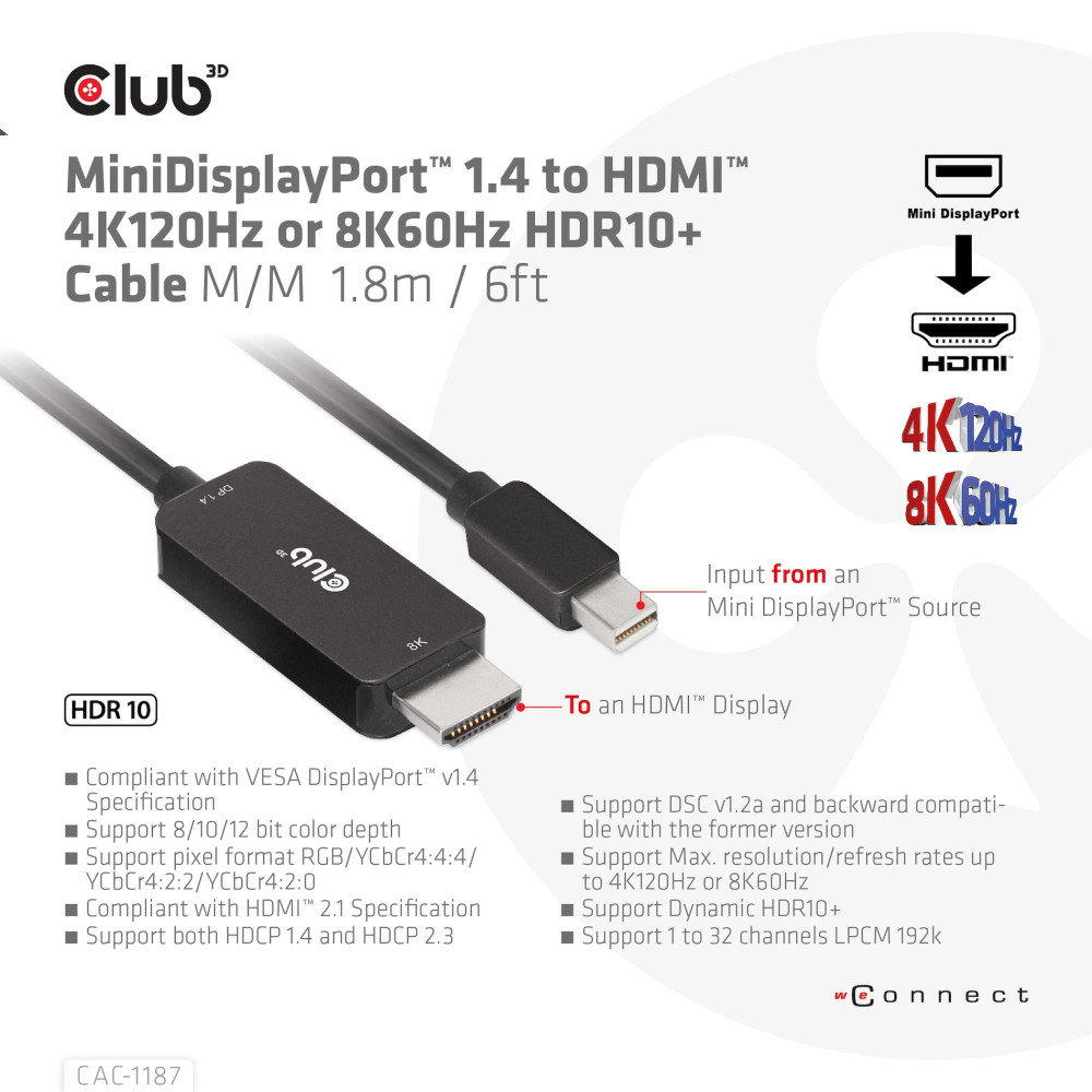 CLUB3D CAC-1187. Длина кабеля: 1,8 m, Разъем 1: Mini DisplayPort, Разъем 2: HDMI. Сертификация: ROHS, FCC, CE EMI. Plastic packaging weight: 5 g, Paper/cardboard packaging weight: 45 g. Connector 1 dimensions (WxDxH): 10,6 x 34,2 x 8 mm, Connector 2 dimensions (WxDxH): 20 x 63 x 11 mm, Вес: 63 g. Ширина упаковки: 145 mm, Глубина упаковки: 45 mm, Высота упаковки: 145 mm