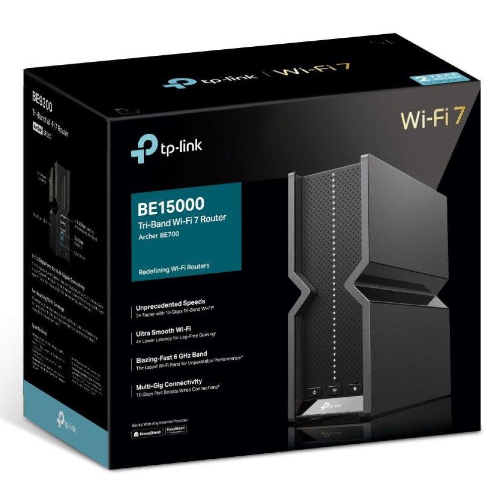 TP-Link Archer BE700. WAN connection type: RJ-45. Wi-Fi band: Tri-band (2.4 GHz / 5 GHz / 6 GHz), Top Wi-Fi standard: Wi-Fi 7 (802.11be), WLAN data transfer rate (max): 15000 Mbit/s. Ethernet LAN interface type: Multi-Gigabit Ethernet, Ethernet LAN data rates: 25000 Mbit/s, Networking standards: IEEE 802.1x. Fiber optic connector: SFP+. Security algorithms: WPA, WPA-Enterprise, WPA2, WPA2-Enterprise, WPA3