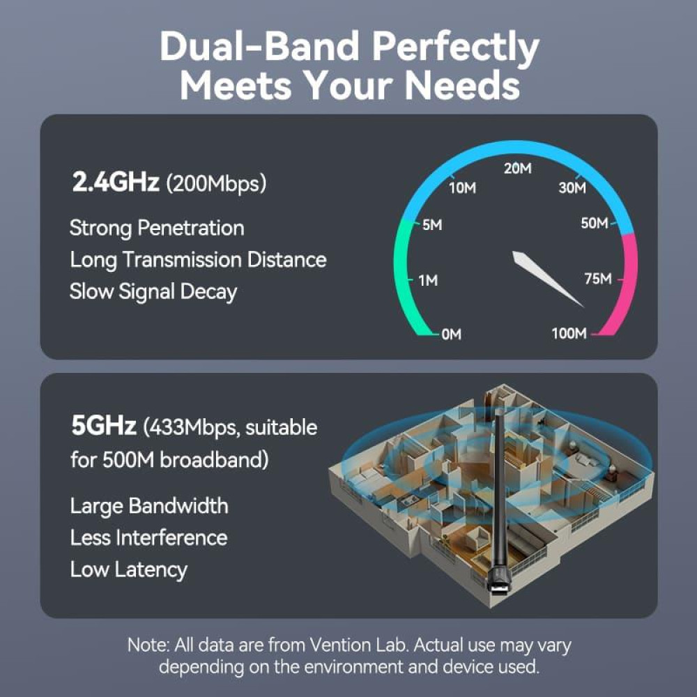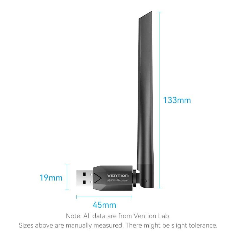 Summary Vention USB Wi-Fi Adapter. Connectivity technology: Wired, Host interface: USB, Interface: WLAN. Maximum data transfer rate: 633 Mbit/s, Top Wi-Fi standard: Wi-Fi 5 (802.11ac), Wi-Fi band: Dual-band (2.4 GHz / 5 GHz). Product colour: Black